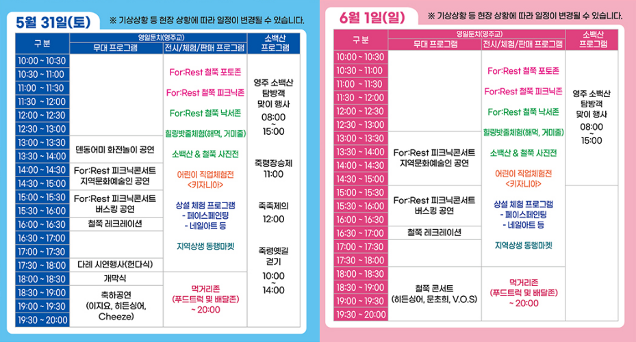 올해 소백산 철쭉제 일정은 5월 31일(토)부터 6월 1일(일)까지 총 2일간 진행됩니다.